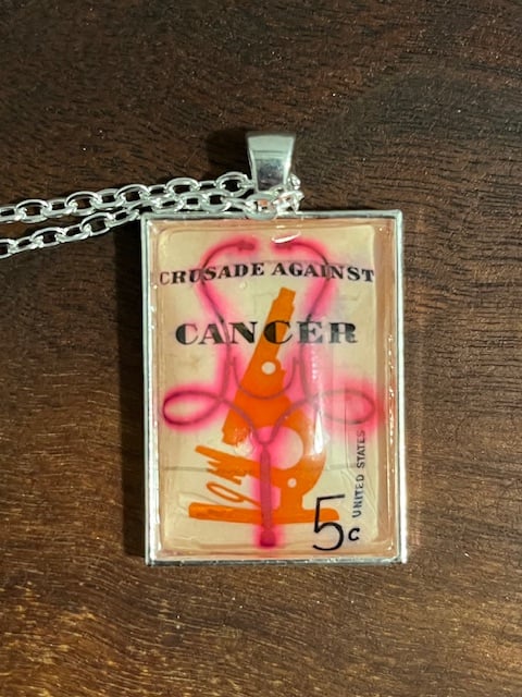 This stamp was issued to publicize the important fight against cancer through early diagnosis, treatment, and research. It pictures symbols of the medical field – a stethoscope and microscope.