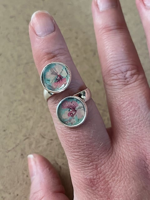 Different flowers depicted are from various vintage stamps, and one ring with butterfly wings.